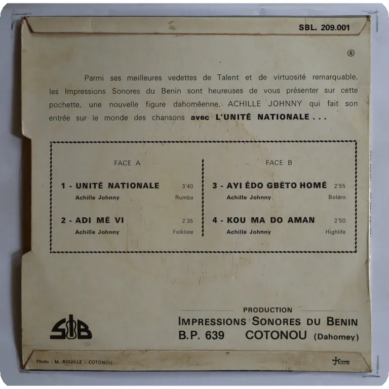 Check the deep hypnotic afro tune, a bolero & a highlife on this mega rare Benin release with backing by the band which became the legendary Poly Rythmo. Light wear on cover. Writings on B side label