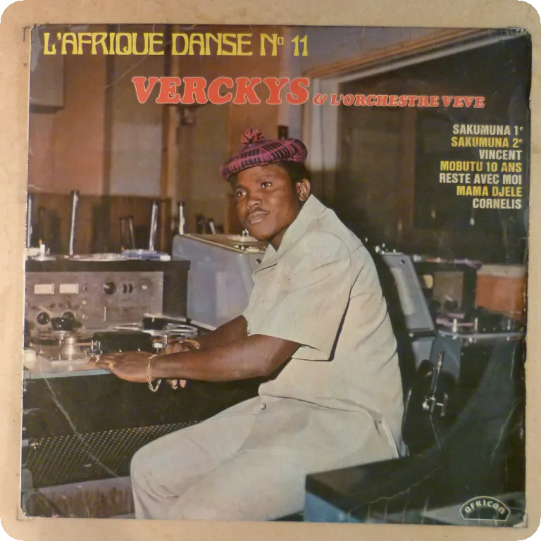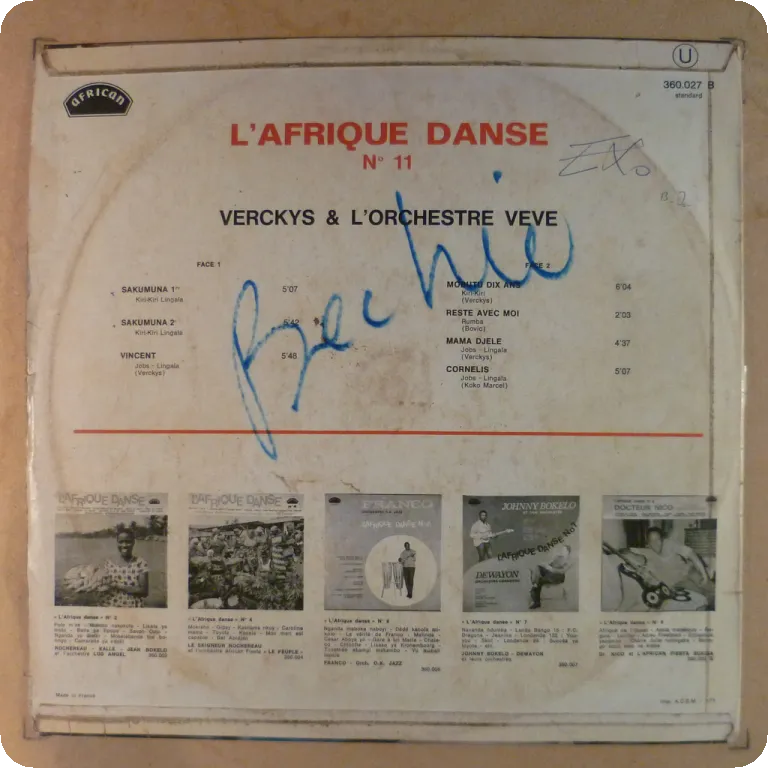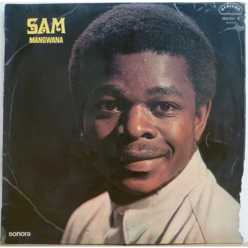 Congolese soukous & psych rumba on Sam Mangwana's debut African label lp, recorded w/ Festival des maquisards orchestra. Sleeve has aging/dirt, narrow bite along bottom mouth, creases, writings on labels, a bit noisy from marks, also A3 "ambi" has greyish damaged cracky grooves.