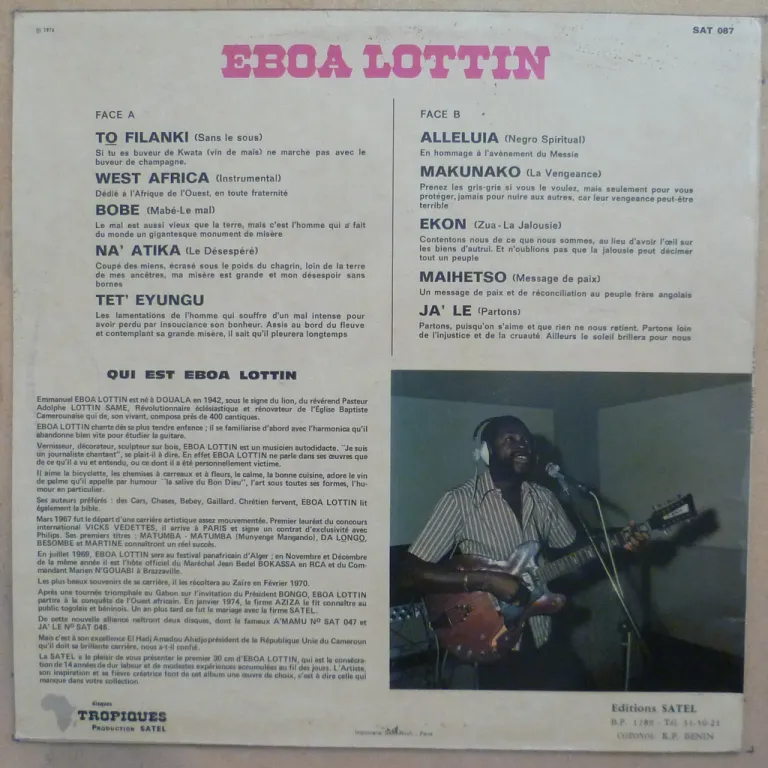Deep & raw folk & bluesy folk masterpiece debut LP recorded by the Cameroon guitarist, and surely hard to get. Sleeve has minor wear writings on labels. Record has light marks, but plays very solid VG- to VG++ w/ light to hardly any noise most of the time, unfortunately has some opaque pressing patches causing wooshes mainly on B4 & 5 and a bit less on B2 & 3.