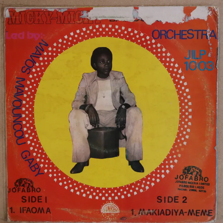 Congolese soukous 2 tracks masterpiece recorded in Nigeria, some aging & dirt on cover, peel off & light brown water damage along top, mini bite on spine, plays with noise on intros to sides as can be heard on clips, from marks on edges otherwise really quite clean and plays up to VG+ through side