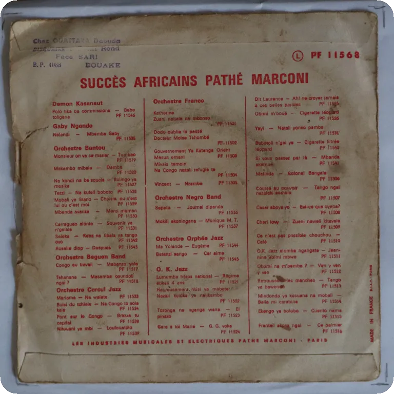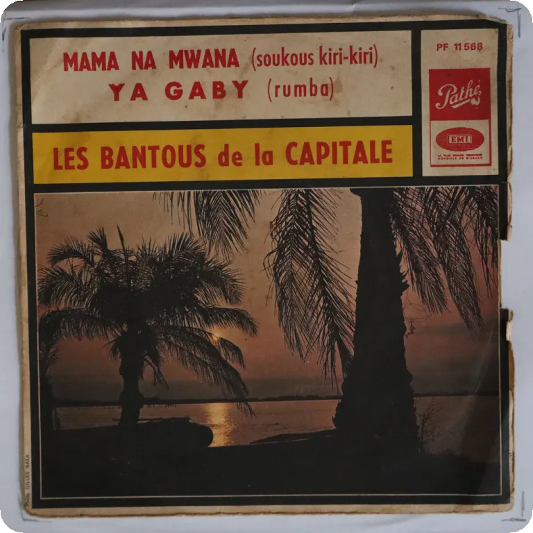2 single only rumbas by the Brazzaville superstars, later compiled on LP, sleeve has aging & dirt, bite & tears on mouth, 5" split on spine, 3" split on top, ringwear & shop stamp on back, writings on