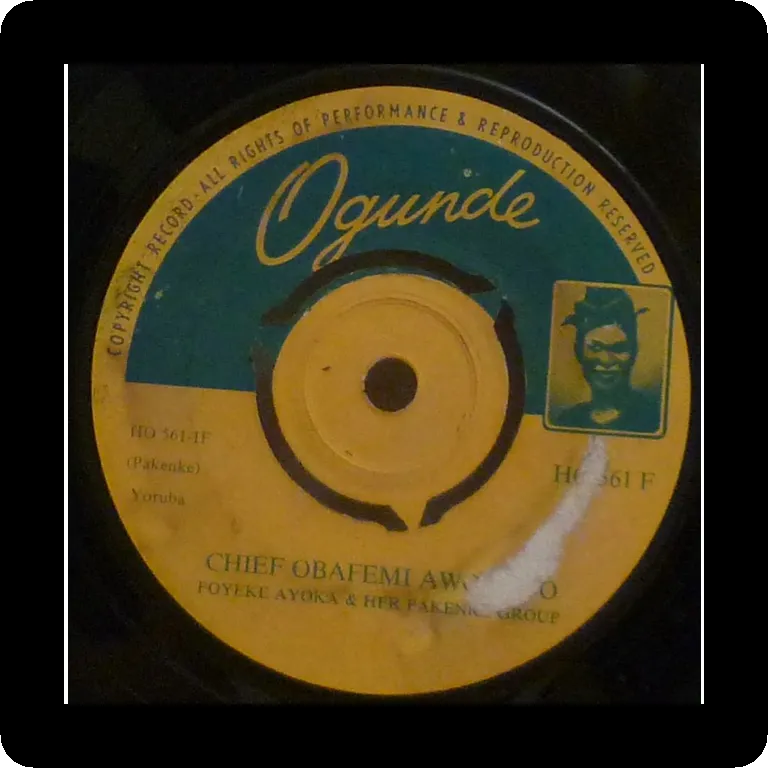 Tiv folk music w/ male vocals, percussions & horn on side A, acapella on side B, from Eastern Nigerian Benue state. Scarce ! Sleeve is VG-w/ aging & dirt, writings on back & labels, bite on bottom front. Record plays G to VG- to VG. Side A is noisy on edges and plays much better as needle reaches end of the side, up to VG without almost any noise. Side B is noisy constantly, from G+ to VG-