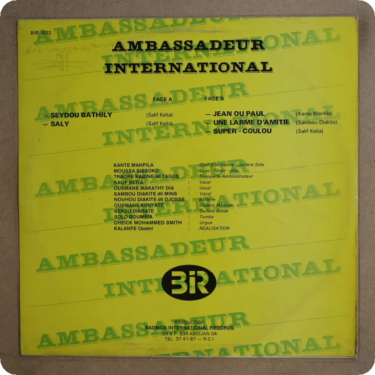 Consistent manding LP that features a solid funky afro pop/afrobeat tune w/ organ & sax solos, backing by les Ambassadeurs. Also features a manding track that reminds the Rail band..Dirt on cover, shop sticker & some peel off on front, record is in nice shape with only light backing pressing noise in parts.