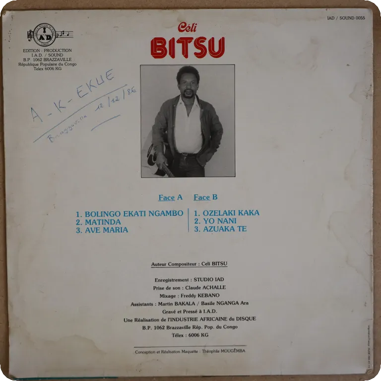 Congolese soukous & rumbas on top as recorded by one of Zaire leading 70's groups. Age wear, dirt, light brown water damage & mini peel off along bottom. Writings & rubber stamps on labels, rubber staps on cover. Record has light noise in parts to no noise, solid VG- to VG .