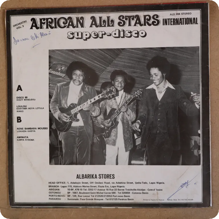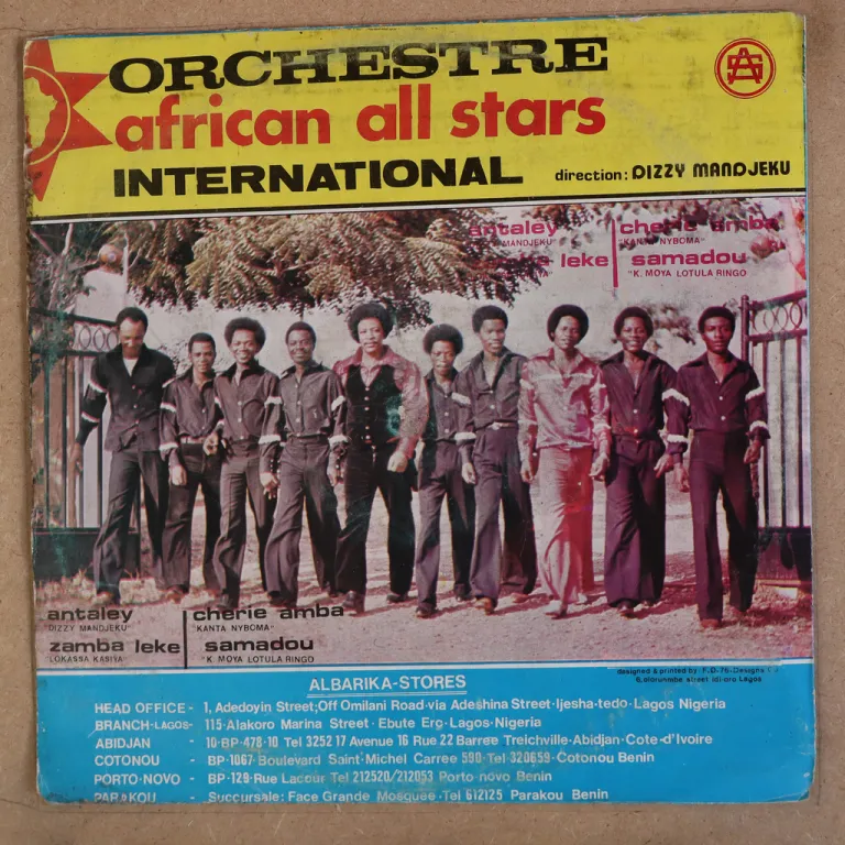 Consistent soukous LP directed by Dizzy Mandjeku and recorded during their stay in Benin, West Africa. Dirt & aging, record in nice shape with only very occasional noise & minor marks & very light opaque pressing hiss.