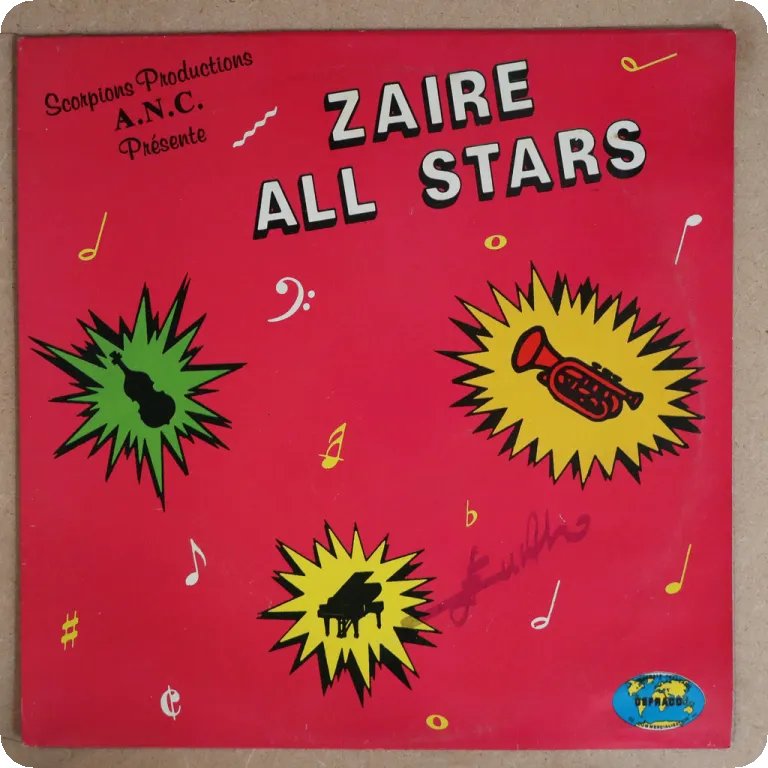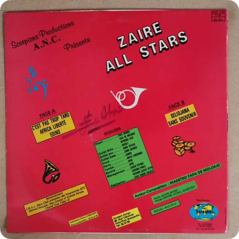 Every soukous tune is a tropical dancefloor winner on this ultra scarce soukous LP recorded by Nigeria based Congolese musicians. Sleeve w/ strong dirt, light brown water damage wear along bottom, ringwear. Record plays w/ constant reasonable to light noise from numeerous marks
