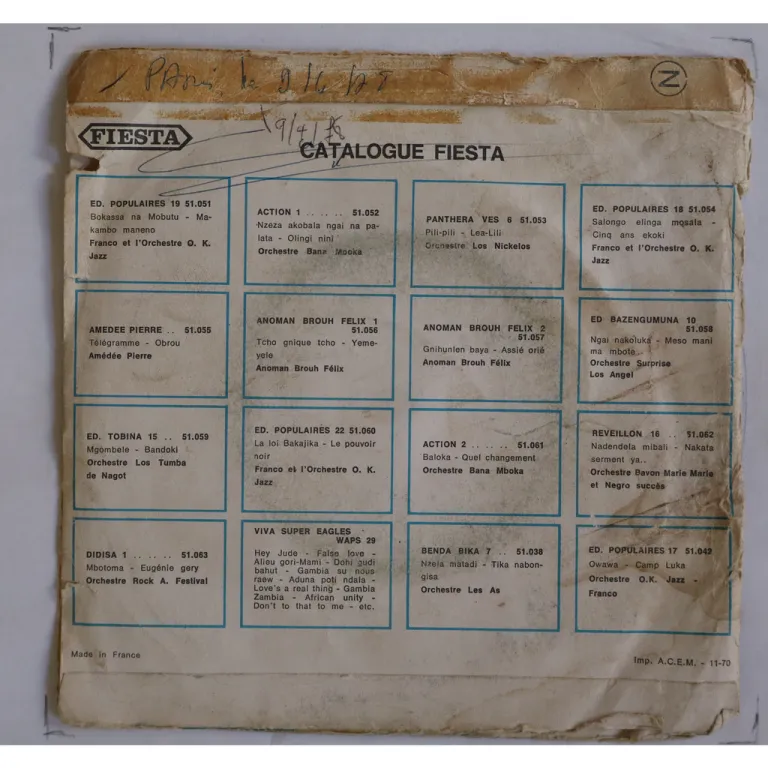 Single only rumba double sider rarity by this short lived Congolese group. Sleeve has split on all edges & spine, comes in two separate parts, strong wear, glue residue along top, bump & tears on spine, creases, ringwear and writings on back, beige water damage, record has marks & csntant reasonable to light noise.