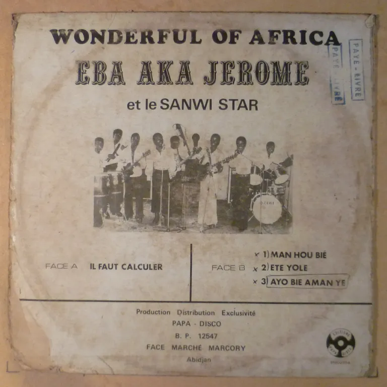 Sweet laid back afro latin tune & 2 soukous tracks on this Ivory Coast LP, sleeve has strong wear, bite & peel off on bottom mouth, strong ringwear, rubber stamps on back, writings, 2,5" split on bottom, misprint on labels, record plays with quite reasonable to light noise from numerous marks