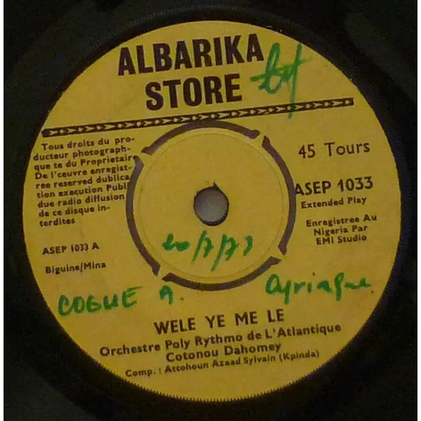 Without a doubt one of the Kings of Benin best highlife tracks recorded on B side, A side is a biguine tune that drops into a soukous beat as recorded on this much scarce release, writings on labels, constant reasonable noise from numerous marks.