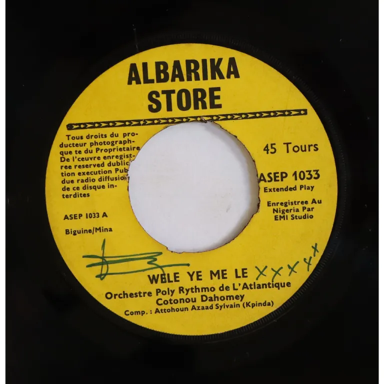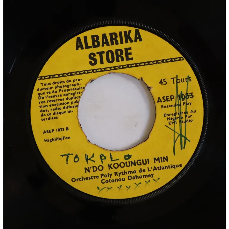 Without a doubt one of the Kings of Benin best highlife tracks recorded on B side, A side is a biguine tune that drops into a soukous beat as recorded on this much scarcer single only release, swritings on labels, light to hardly any noise, varies from VG to VG++.