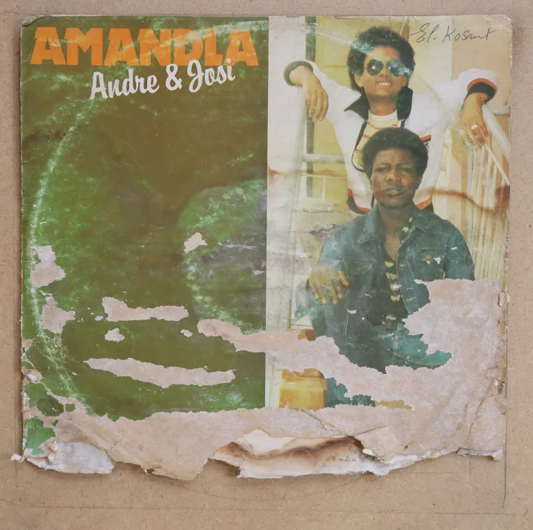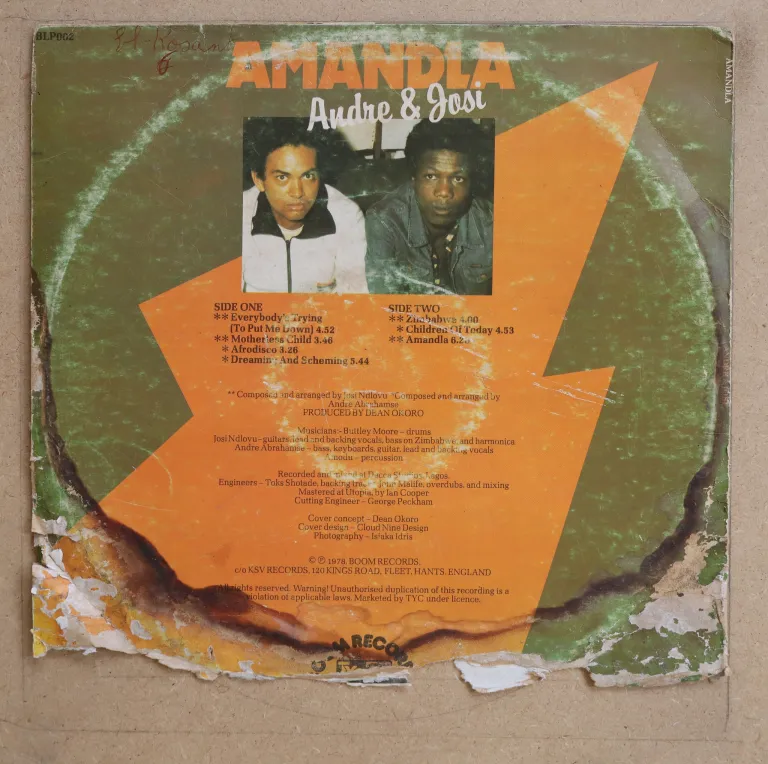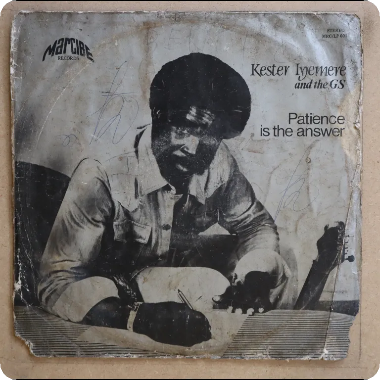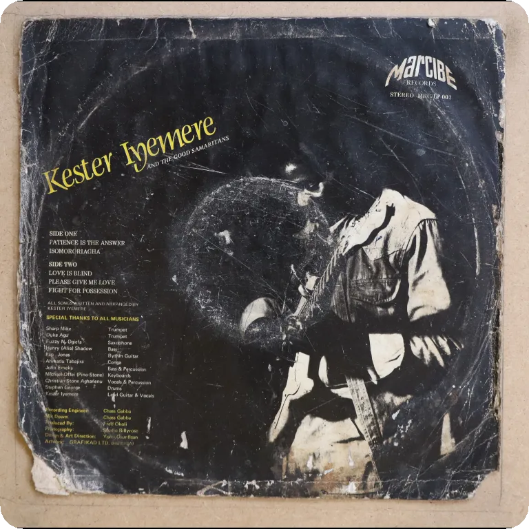 Almost every tune is a winner on this afro psych disco, modern soul & roots reggae Nigerian rarity, very serious wear o cover w/ 15% of bottom cover missing, large peel off, strong ringwear, large dark brown water damage wear visible mainly on back & bottom front, peel off & writings on B side label, writings on top front, record has light to hardly noticeable noise from light marks & opaque wear, ranges from weak VG to VG+.