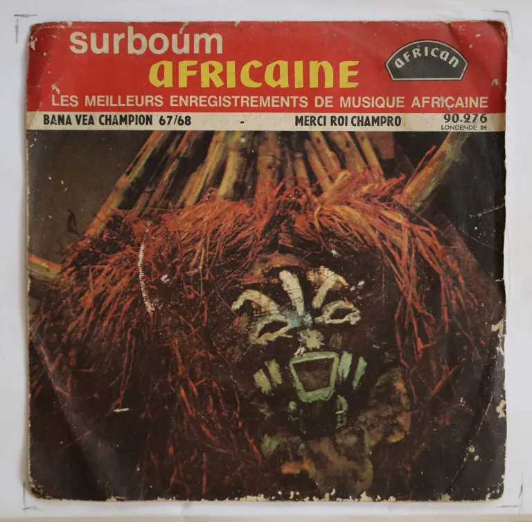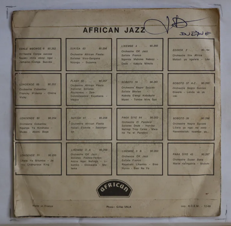 Congo psychedelia on top w/ crazy guitar solo & a psych rumba on this scarce release by one of the country's leading 60's bands. Sleeve has aging & dirt, several mini peel off, creases, writings on back & labels, record has reasonable to very light noise, ranges from VG- to solid VG depending on parts.
