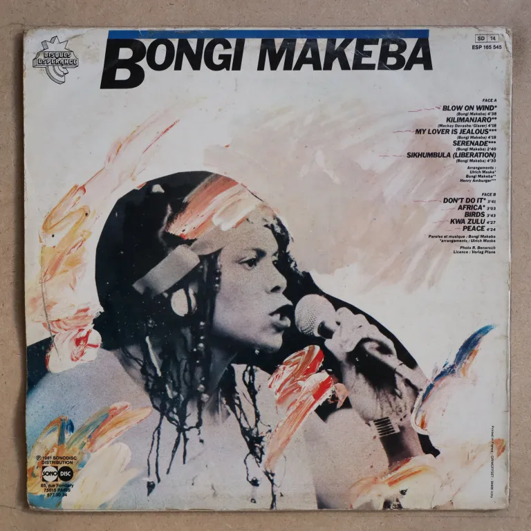 Killer afrofunk disco & breezy afro jazz fusion tunes as recorded by Myriam Makeba's daughter. Wear & aging on cover, light creases, some warp along mouth, writings on A side label. Record has reasonable to hardly noticeable noise from marks, ranges from VG- to solid VG, noisiest part is A side intro (clip 3)