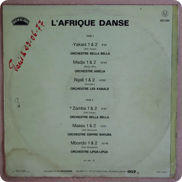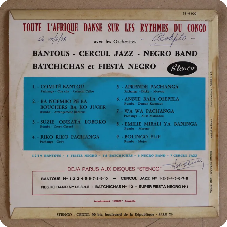 Solid Congolese pachanga tunes including the dancefloor friendly "wa wa pachanga" & "riko riko pachanga". Sleeve has dirtwear & light aging, writings on back & labels, ringwear on back, dirt on labels