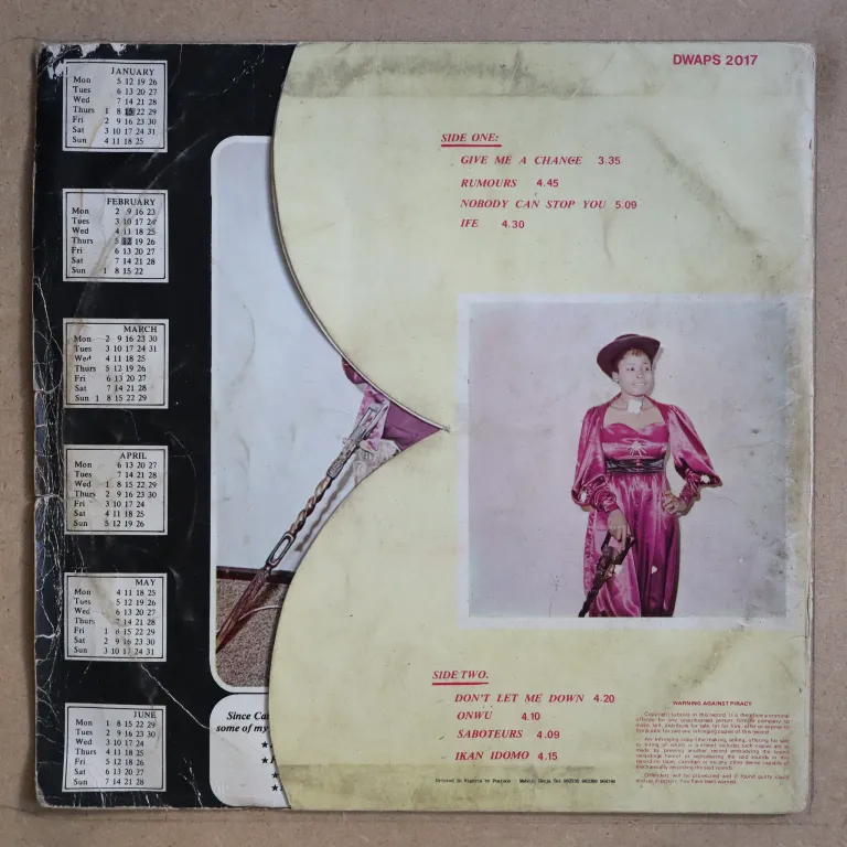 "Rumours" & 2 other funky tunes on this classic Nigerian LP by the funky soulsister w/ backing by the Nigerian funk legends. Sleeve has aging/dirt, bump & a few tears on moth, some creases, record plays with quite reasonable to light noise from multiple marks