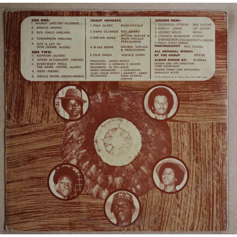 Serious Nigerian afro psych funkiness as recorded by the legendary group on their debut release, sleeve has light wear, bump & mini tear on mouth, 2,5" split on spine, record has light noise only most of the time and plays quite well, unfortunately a pressing bubble on each side causes skips on first track of each side making the standouts Amayo & In concert unplayable. So ranges from F on those to solid VG-/VG on the best playing ones.