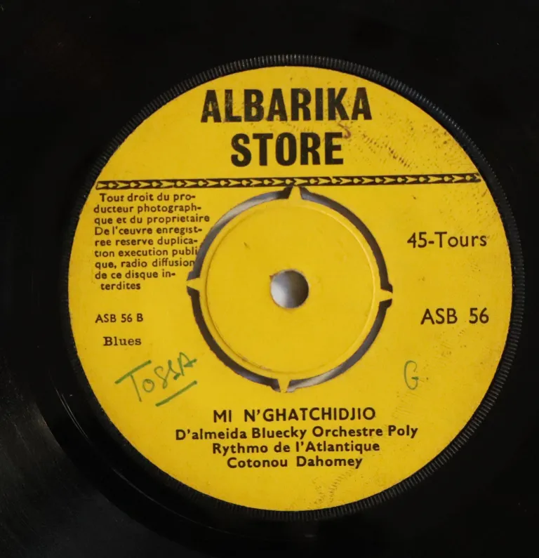 Check the montuno on part 2 to B side which starts as a rumba, A side is a biguine. Scrace Benin release. Sleeve has strong dirt, aging, creases, peel off, writings on back & A label, dirt & shop