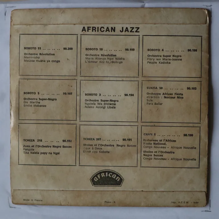 Afro psych / funky jerk w/ solid guitar solo recorded in Congo, sleeve has aging & dirt, 1,5" split on spine, light noise from marks up to no noise on the funk tune, the rumba track plays a bit worse, VG- w/ constant reasonable noise