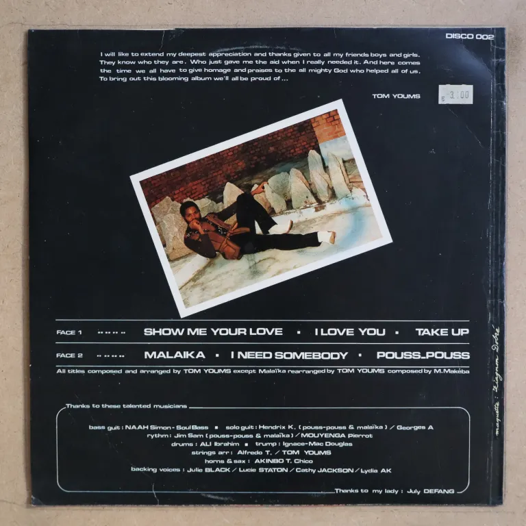 Afrosynth disco by the Cameroon singer, feat. "Show me your love" & "take up". Sleeve has minor wear, large writings on labels, record plays with light to hardly noticeable noise only despite marks, VG to VG+