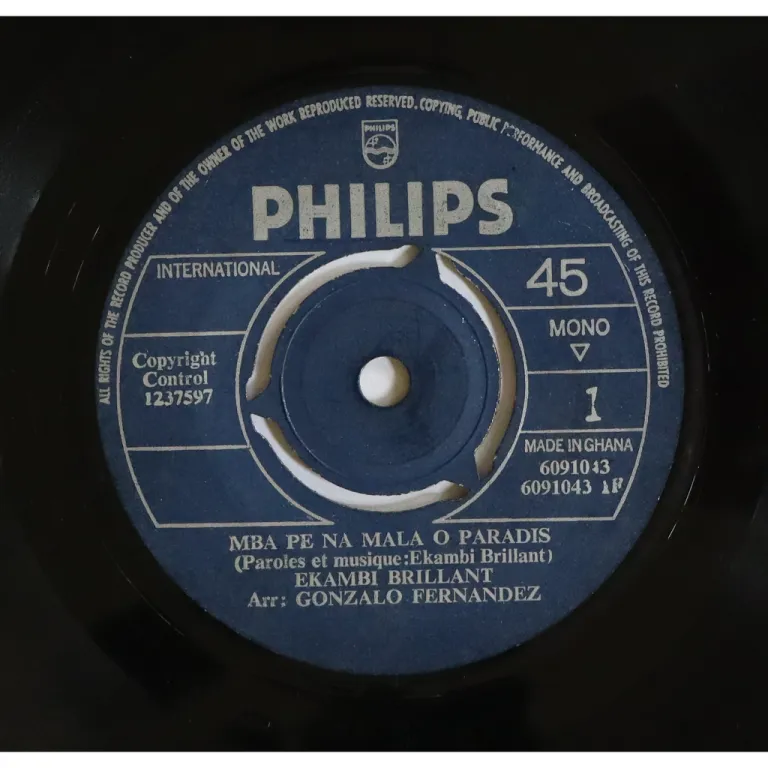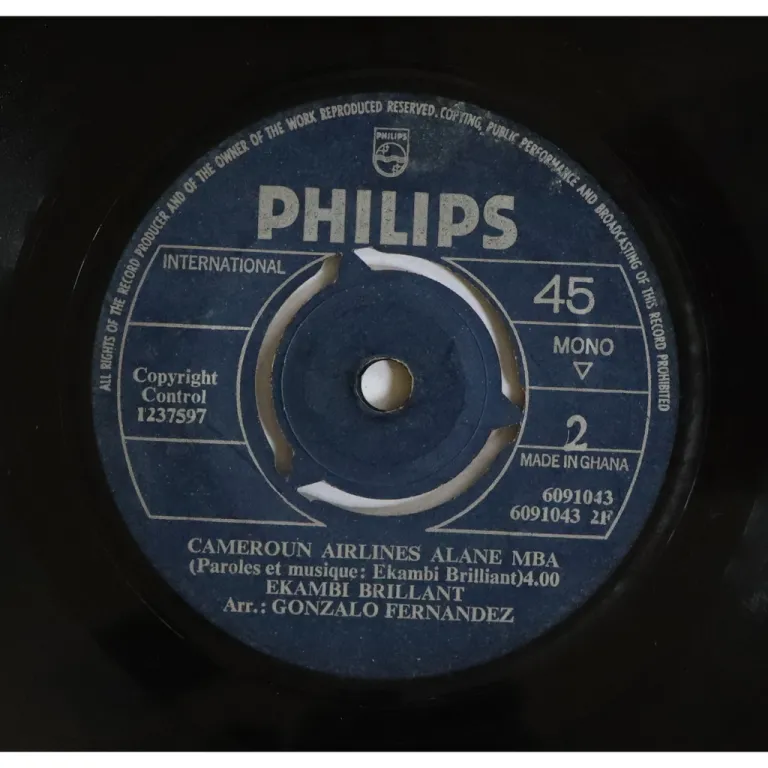 A mellow afro soul and a country music tune by the Cameroon artist, both arranged by Paris based Cuban flute master Gonzalo Fernandez. Record has constant reasonable noise from numerous marks, clicks for 30 seonds at the end of B side's country track from mark.