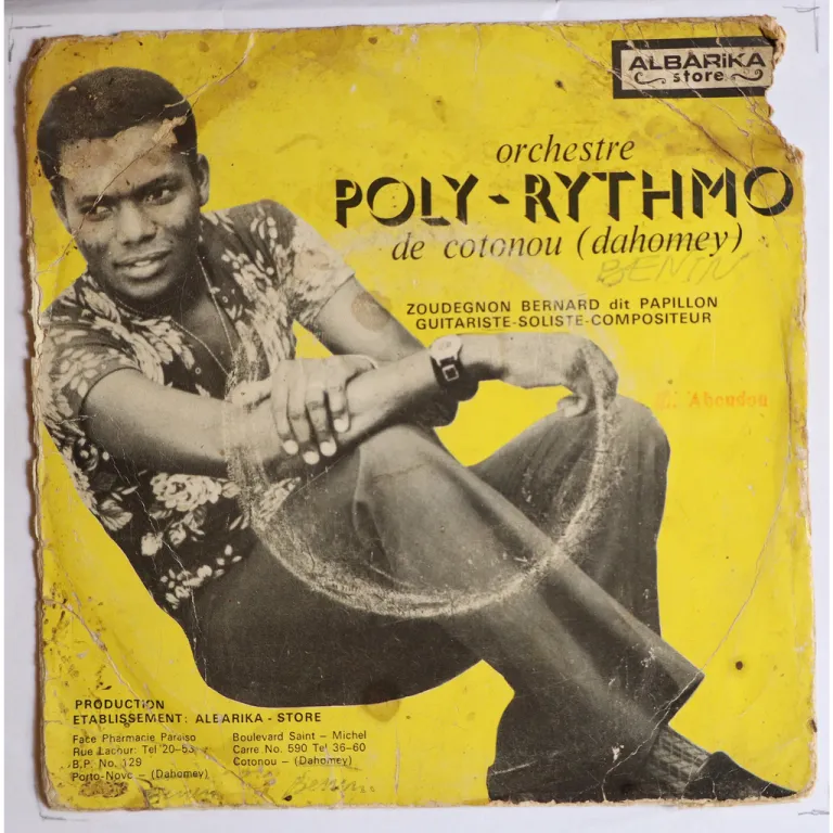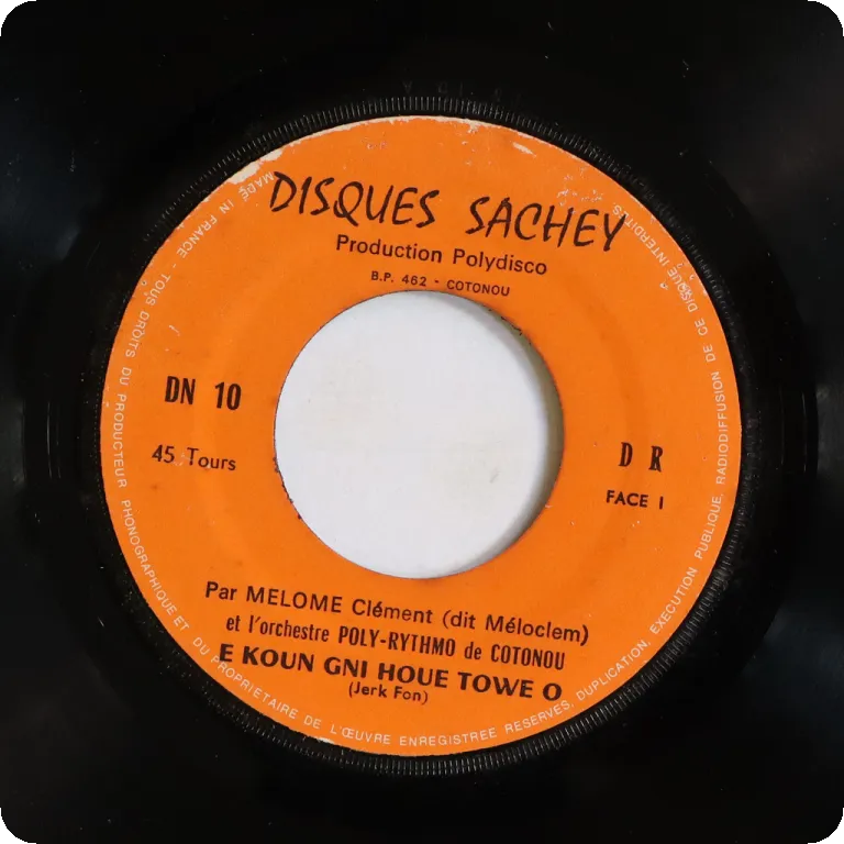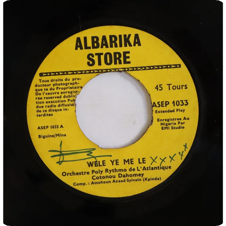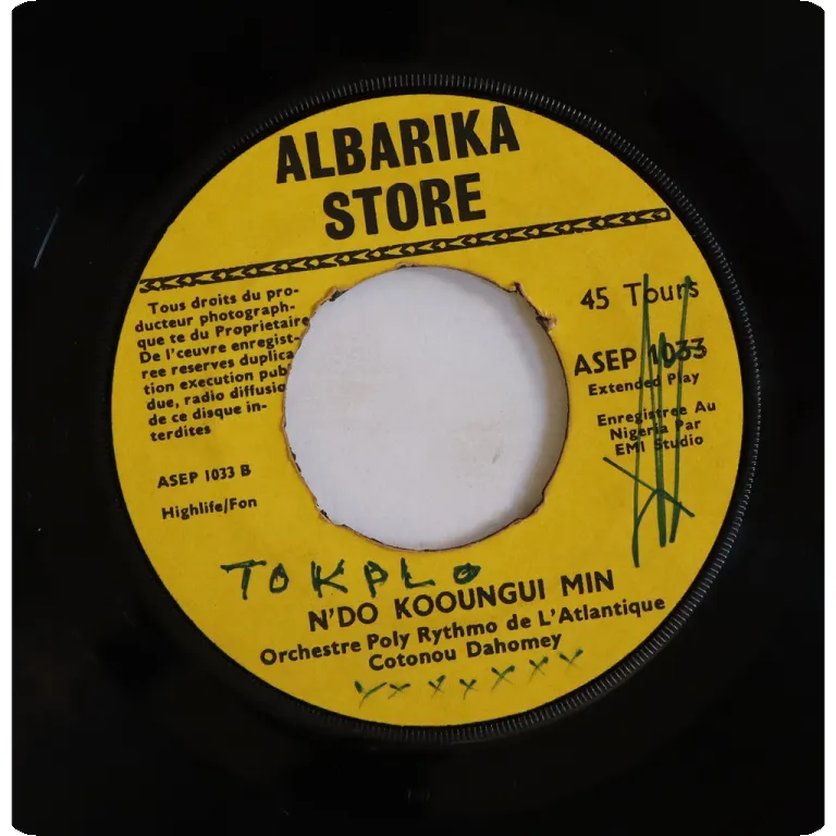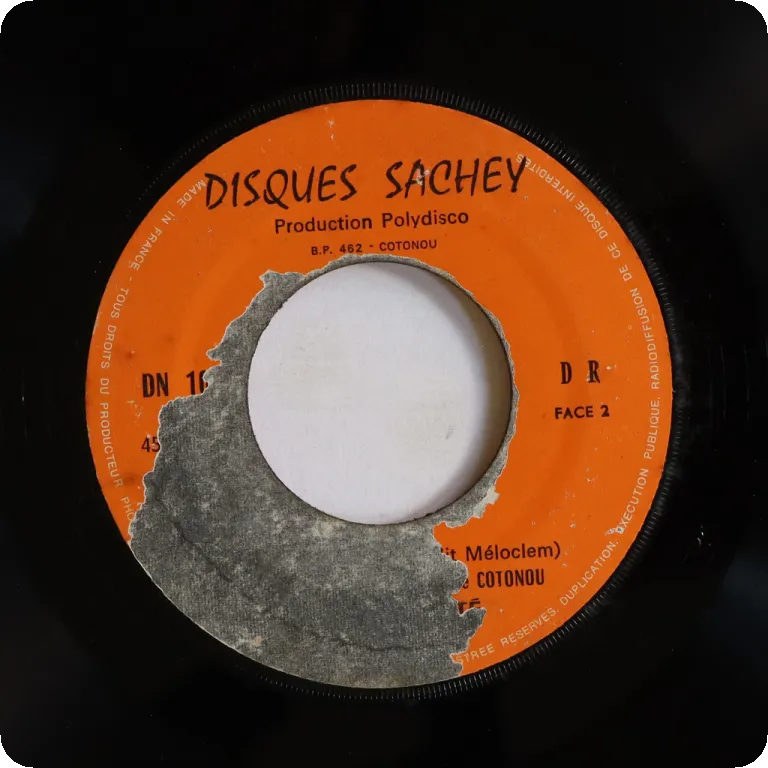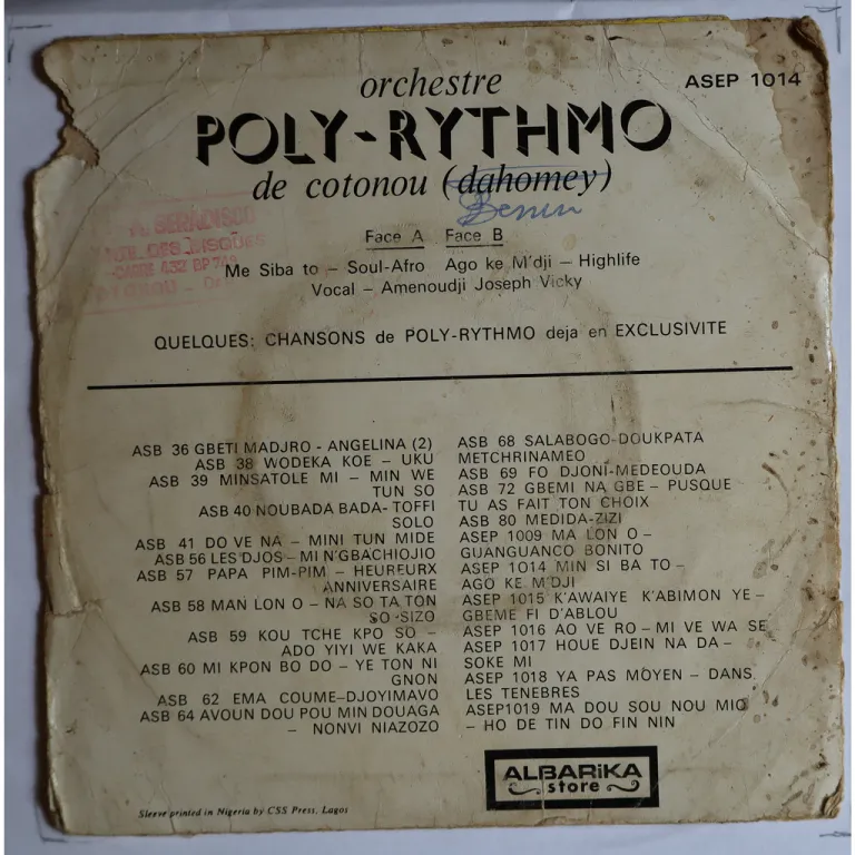 Surely among the best afro funk relreases by the Benin kings, solid mid tempo afrobeat/afrofunk tune w/ organ & guitar solos. A highlife on side B. Strong dirt & wear on cover, peel off on front, bite on top mouth, ringwear, creases, beige water damage along top spine, shop stamps & writings, 3" split on spine, discolouration & writings on labels, record has numerous marks & constant strong to light noise, ranging from weak to solid VG-