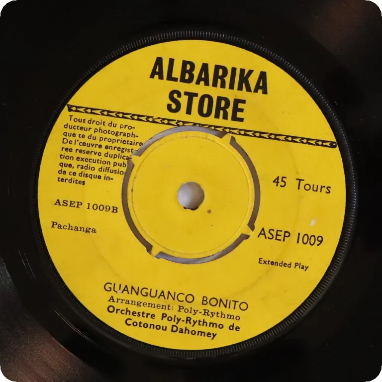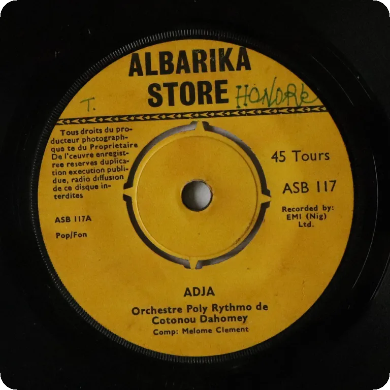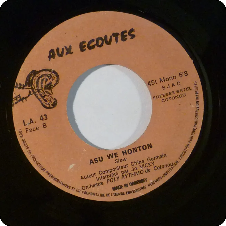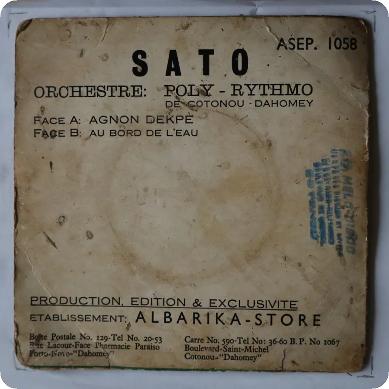 Deep hypnotic afrobeat afrofunk tune, sato style, on this much harder to find release by the kings of Benin, sleeve has aging & dirt, shop stamp on back, dirt on labels, strong ringwear on back