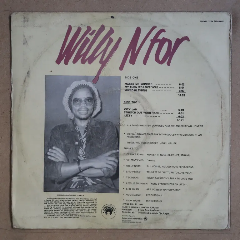 Nigerian afro synth boogie & afro synth pop produced by and featuring Jake Sollo. Sleeve has aging & dirt, light brown water damage wear along spine on 1/4th of cover + some mini tears & mini pieces