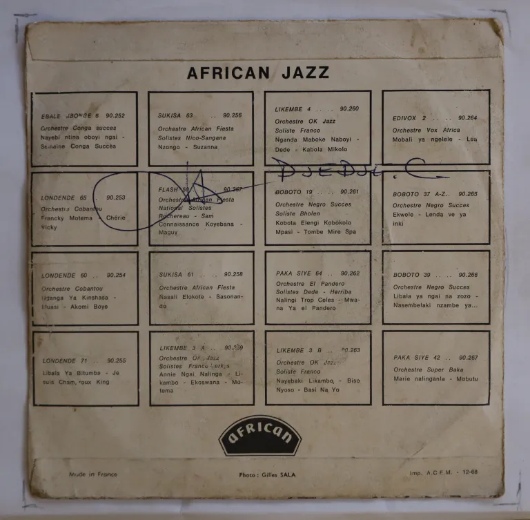 A deep bolero sung in both French & lingala & a rumba on this scrace release by the Congo guitar legend and his group. Sleeve has aging & dirt, peel off on front, writings on cover & labels, record