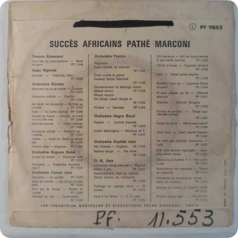 Sweet bolero sung in French with guitar solo and a Cuban son meets Congolese style rumba with wild solos on part 2 on this ultra rare Beninese single, wear & dirt on cover, 1" split on spine & top