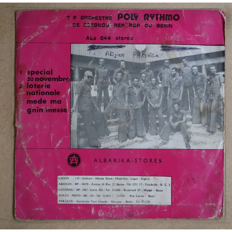 This one has a killer one side long funky trance track called Mede ma gnin messe. Also has a very funky hybrid soukous track at Loterie nationale, and a straight ahead soukous / cavacha at title tune. Extremely rare and good, sleeve has ringwear, creases,bump & 1,5" tear on mouth, 3,5" split on spine, 1" split on bottom, small peel off on bottom spine corner, writings on back & A label, dirt & stain on B label, record reasonable to light constant noise from numerous marks.