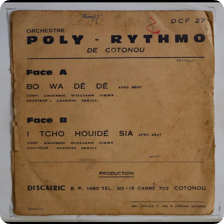 Funky soukous hybrid winners w/ heavy drumming & guitar solo & Eskill on vocals on this Poly Rythmo release. Sleeve has strong aging & dirt, bites on all mouth, split on all bottom & 2" split on spine