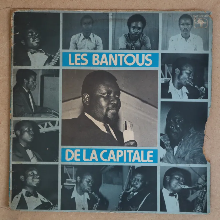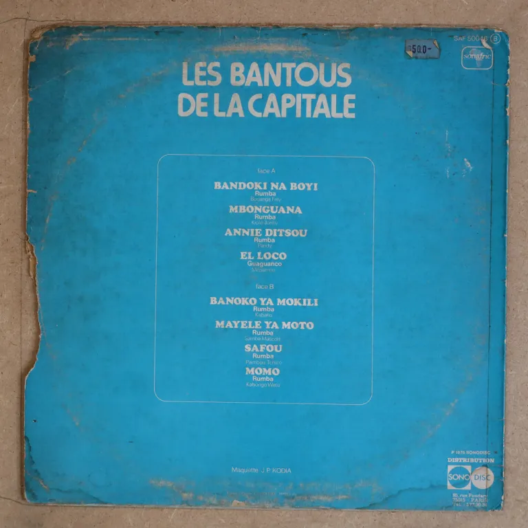 2 single only rumbas by the Brazzaville superstars, later compiled on LP, sleeve has aging & dirt, bite & tears on mouth, 5" split on spine, 3" split on top, ringwear & shop stamp on back, writings on