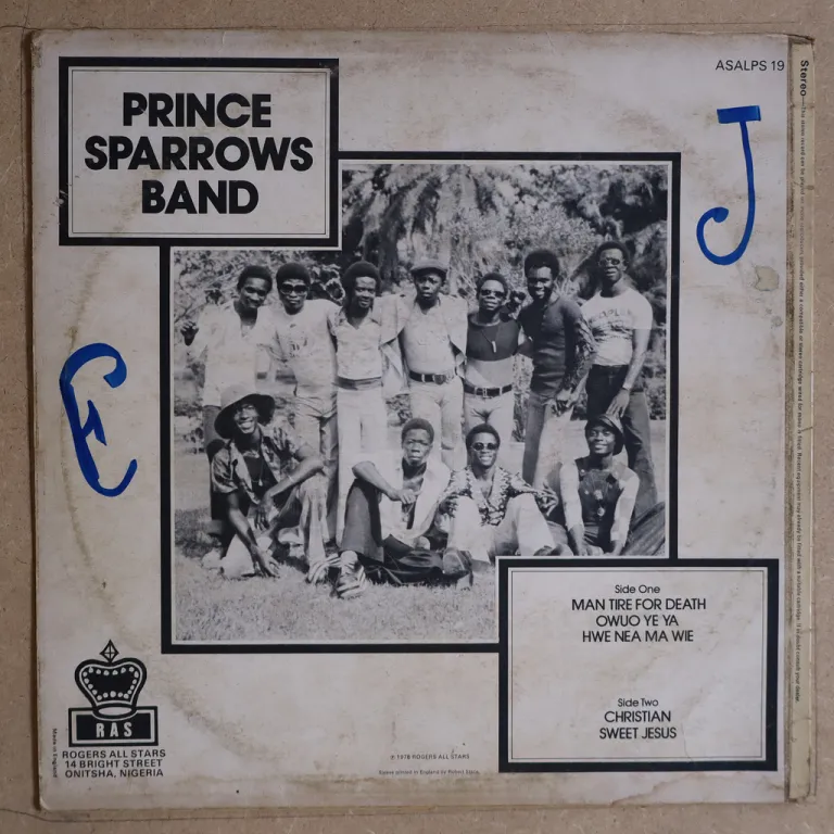 A deep afrobeat highlife tune "akosua manu" & other winners on this now classic super funky Ghanaian highlife LP. Sleeve has aging & dirt, writings, faint beige water damage wear along top, record has