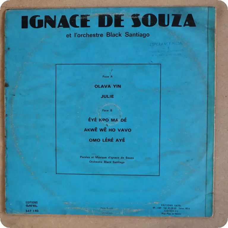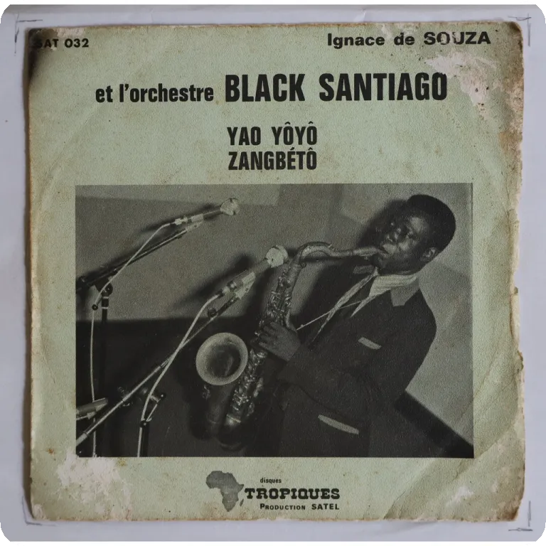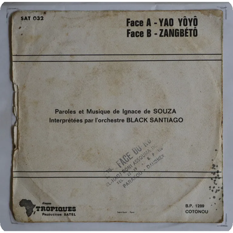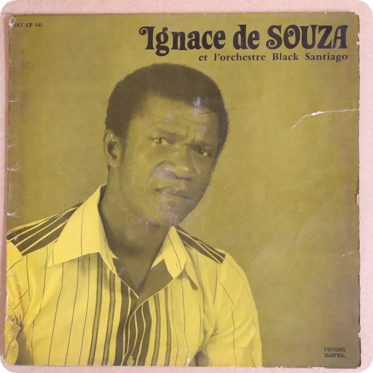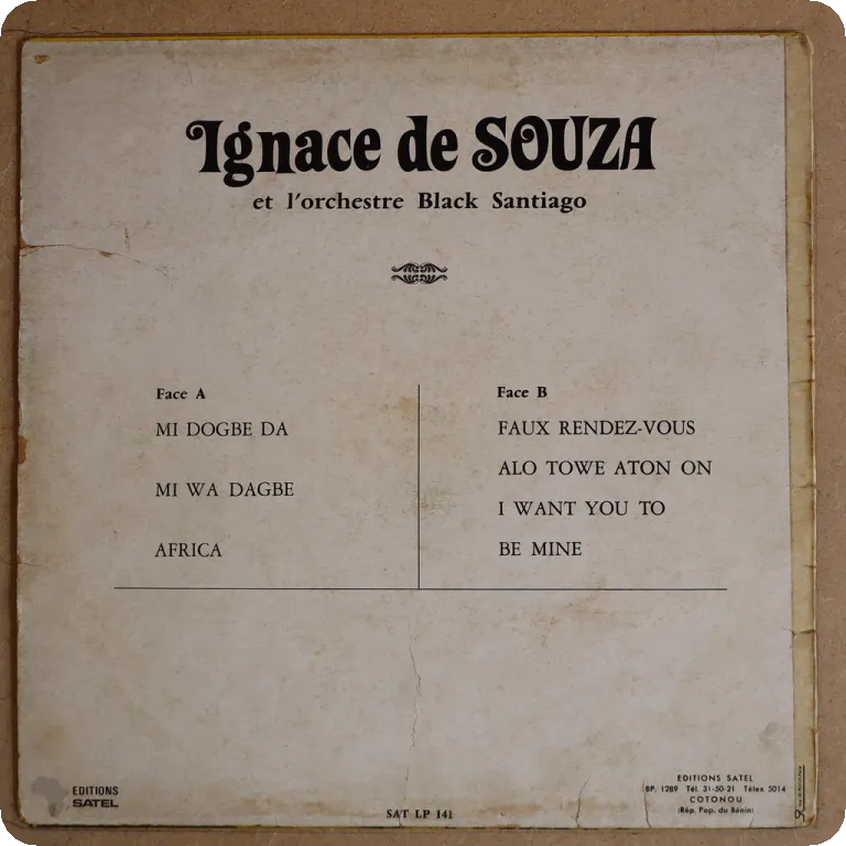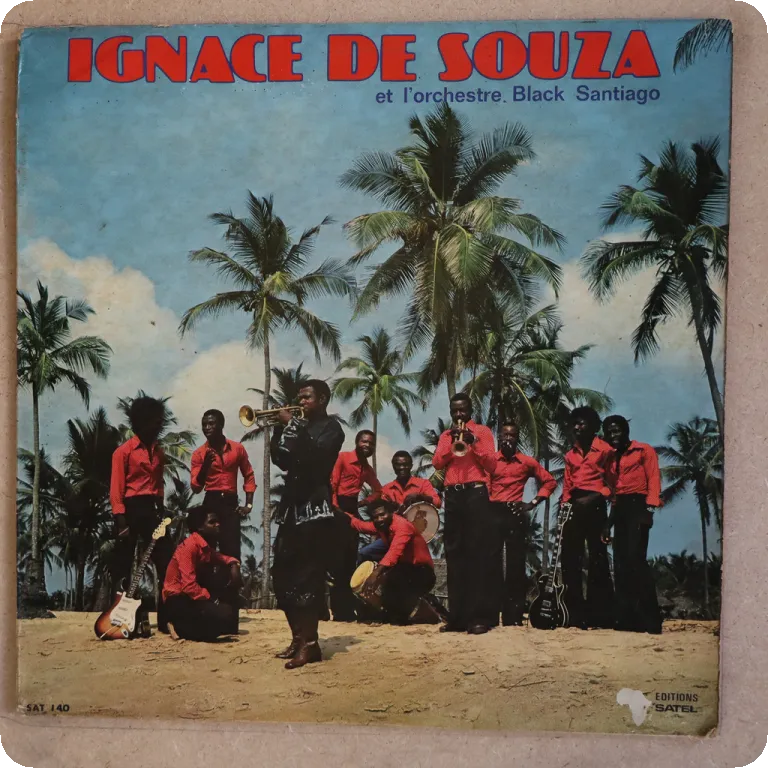 Black Santiago's debut album featuring the killer afrobeat tune "Dou dagbe we" & Ignace de Souza's amazing trumpet solo, also contains a very consistent cover of El manisero. Sleeve w/ wear, some dirt & writings on back, bite on bottom spine, record plays with reasonable noise & clicks and has numerous marks.