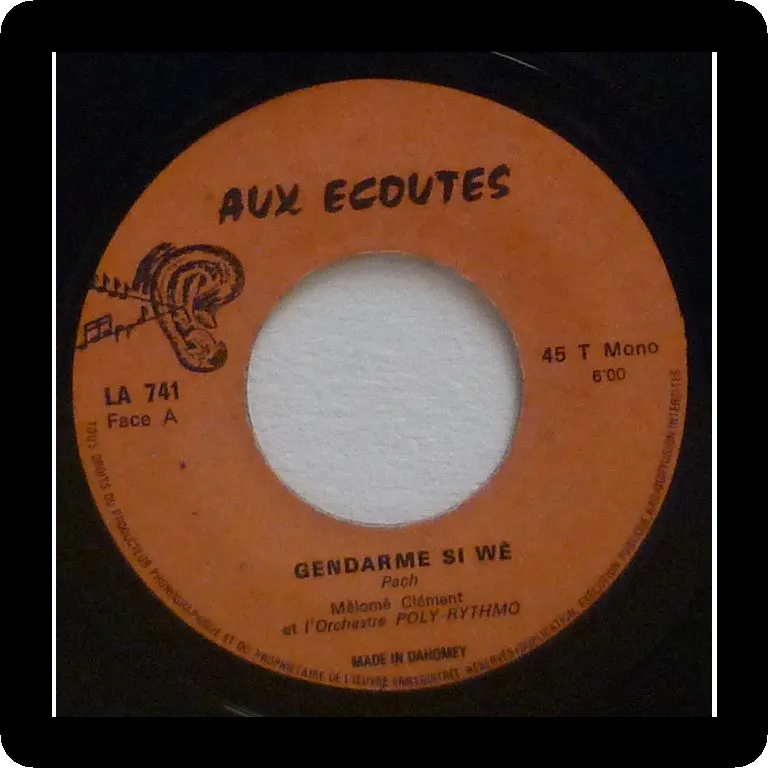 A deep afrofunk psych winner & a pachanga, both with solid guitar solos by Poly Rythmo's bandleader Melome Clement. Sleeve has dirt & aging, red stain on front, shop stamp on back. Writings, dirt & peel off on labels, record plays w/ constant strong to reasonable noise from serious marks, F to G, less noisy on second part of sides, a skip on intro to the afrofunk track (clip 1).