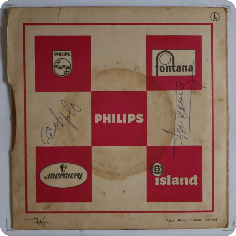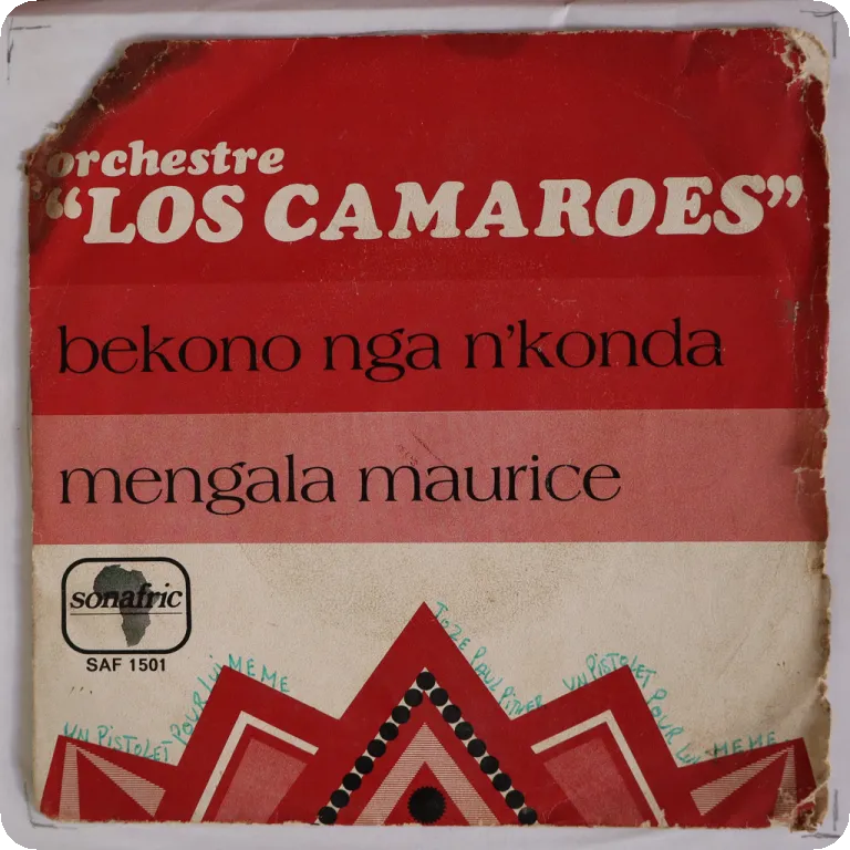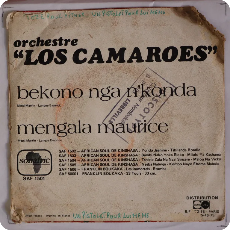 Afro funk meets French pop on this double sider by the Ivory Coast singer. Sleeve has dirt wear & aging, distributor stamp on front, 1" horizontal tear on spine & small bite, also 2 tears on top front, writings & 1" round tear on back, record has marks and plays really well with only issues on intros (check clips)