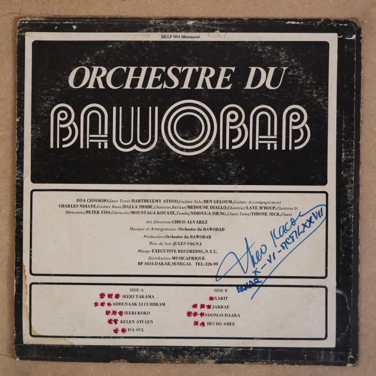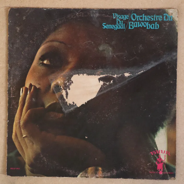 Ultimate modern Guinean Manding music masterpiece. Sleeve has dirt wear & aging, long bite along bottom seam, large peel off along mouth on back, 2" & 0,5" tears & bump on mouth, 4" split on top, 1,5"