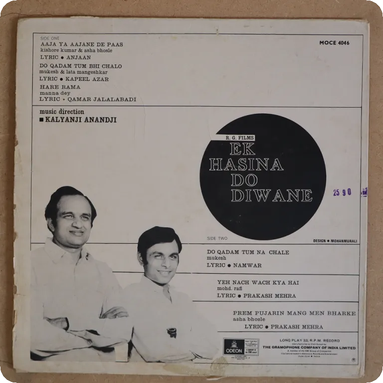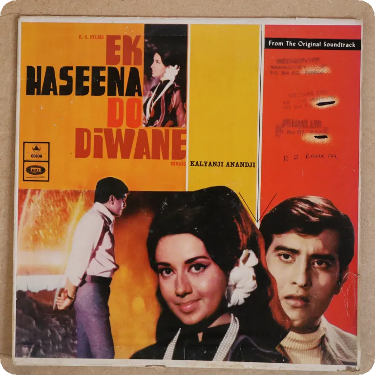 Cover only, no vinyl. Sleeve has wear & dirt, rubber stamp on back, 9" split Hasina Maan Jaayegi along top & 11" split & glue residue along bottom, 2,5" split on spine, some peel off on back, bump on mouth