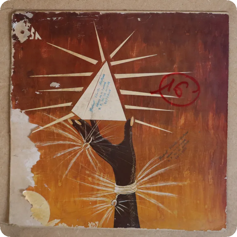 Cover only, no vinyl. Sleeve has strong dirt & aging, peel off & large paper tape stuck, creases, bump on mouth, glue residue along edges, 7" split on spine, ringwear