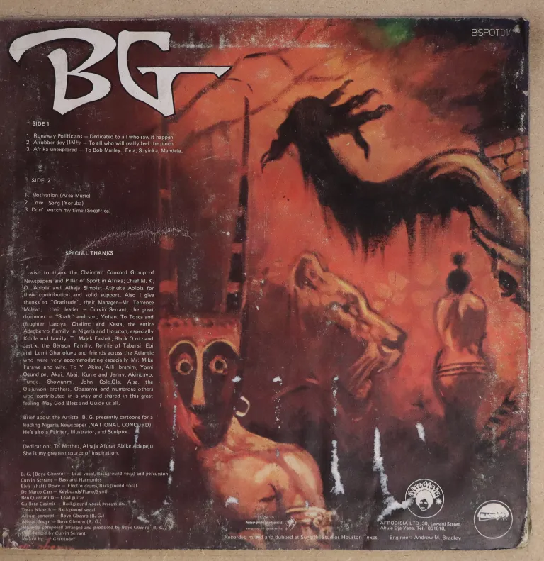 Roots reggae rarity recorded in Houston Texas by Nigerian artist. Sleeve has aging & dirt, warp, peel off & paper stuck from humidity on back & inside gatefold, mold wear & dirt on A side label. Record has light to hardly noticeable noise from light marks, ranges from weak VG to VG++ depending on parts.