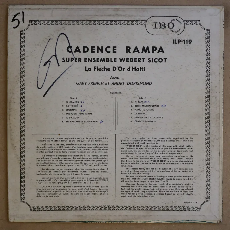 Raw Haiti cadence rampa winners on this 60's rarity by one of the leading bands of the country. Also check great cha cha cha and the raw cadence. Sleeve has minor wear, some dirt, writings on back & B label, record has numerous marks & constant reasonable to hardly audible noise.