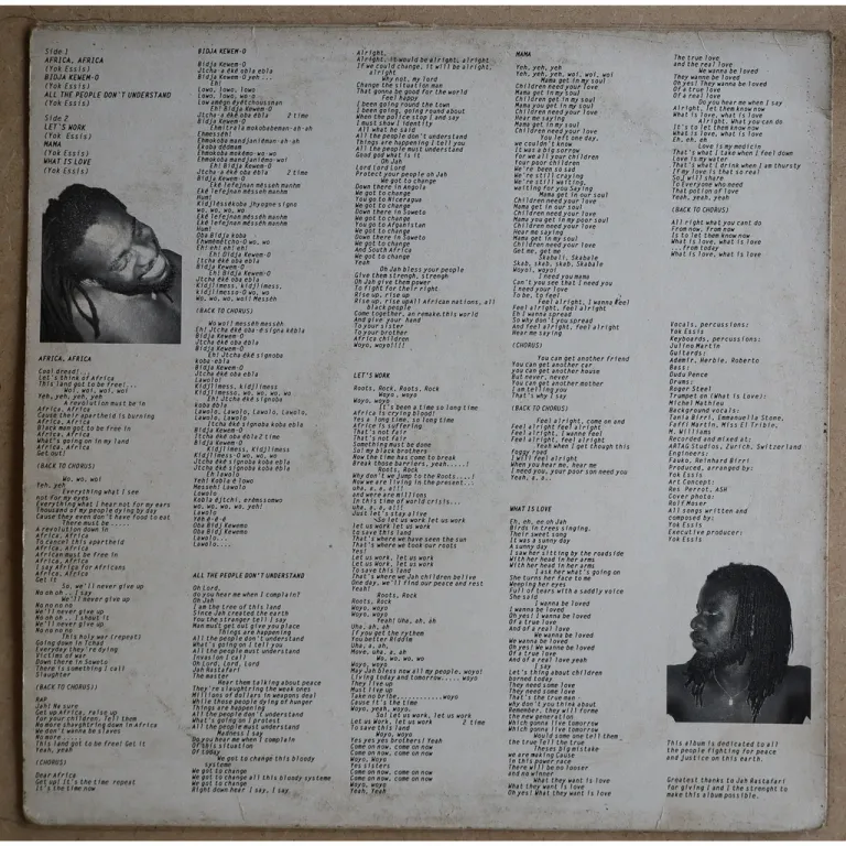 A roots reggae on this otherwise Makossa LP led by the Paris based Cameroon artist. Aging & dirt on cover, record has very reasonable to hardly noticeable noise, worse parts are edges / intros to