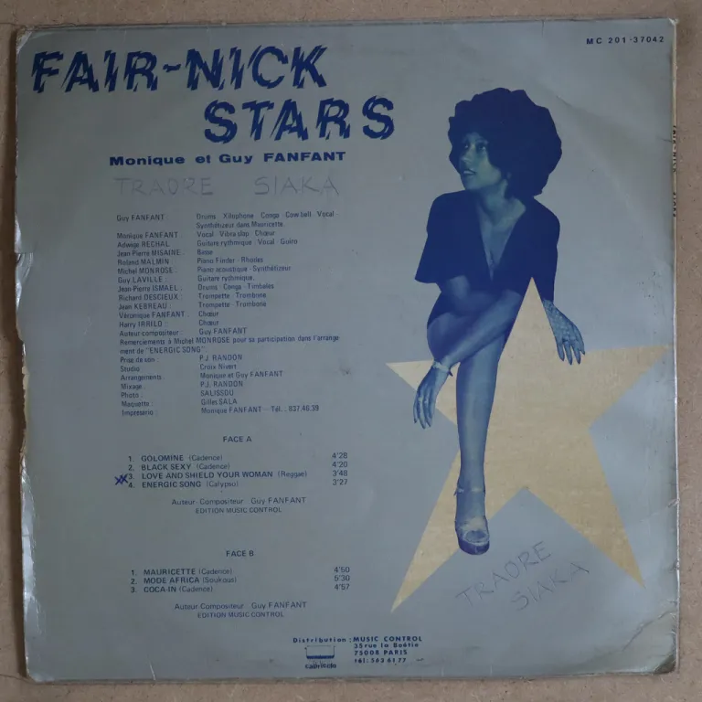 Features an island psych soul, the cadence lypso "tire l'an main'r", a roots reggae "rasta find himself", aging on cover, 3" split on bottom, writing son labels, record has light occasional noise from