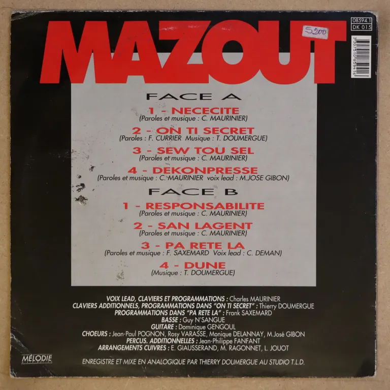 Zouk & zouk love dancefloor friendly tunes on this Charles Maurinier led band release. Sleeve has aging & dirt, ringwear, 2" split on bottom, large writings on front. Light warp, plays nicely.