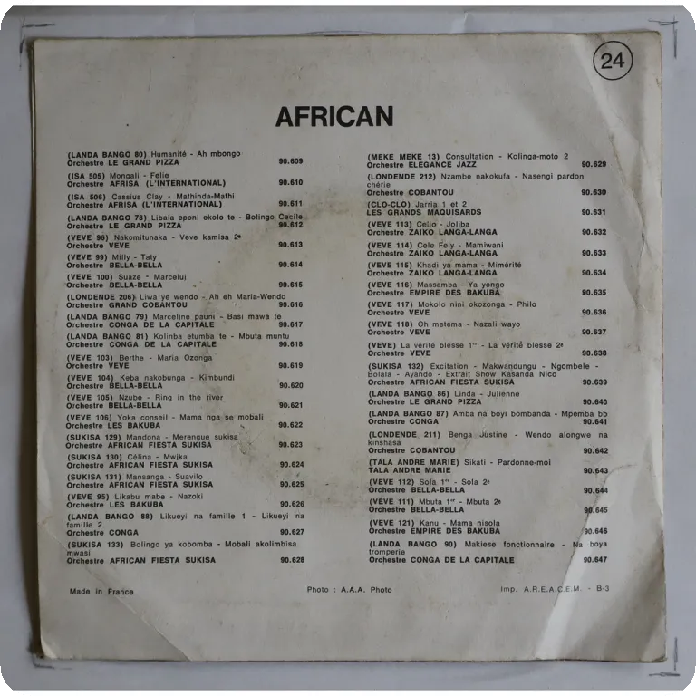 Mid tempo single only Congolese soukous winner by one of Zaire's leading 70's bands. Dirt wear & aging on cover, narrow bite on top spine, quite dirty along spine, strong ringwear on back, record has