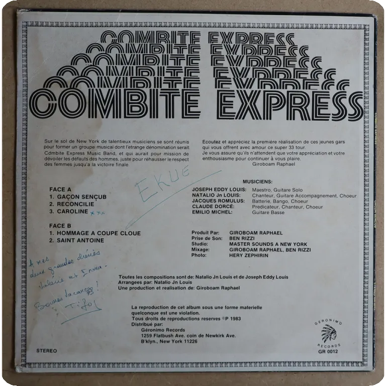 Haitian rhythms as recorded by this New York based group. Light wear on cover, large beige water damage & writings on back, record has light to hardly noticeable noise.