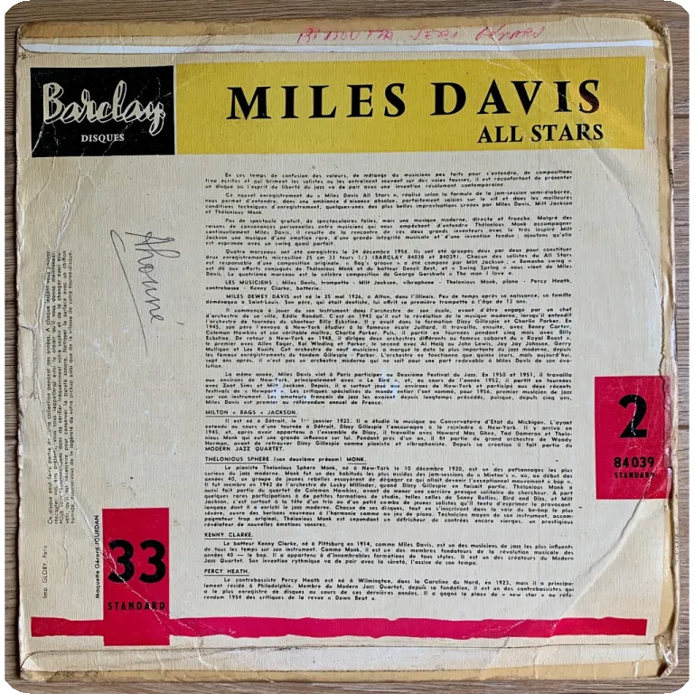 Cool jazz on top as recorded by the trumpet master backed by MiltjACKSON? Monk? Per& Kenny Clarke. Sleeve has aging & creases, writings on back & B label, transparent tape on edges, ringwear, tear &
