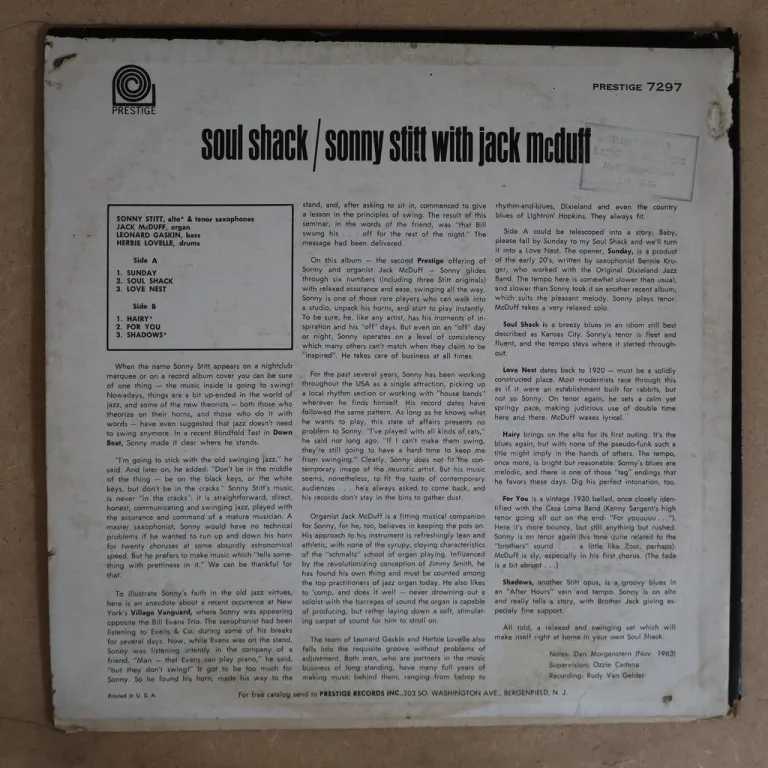 Bluesy hard bop winners by the saxplayer & the organ genius. Original Mono first press. Some wear on cover, stamp & mini bites on upper paper cover & small beige water damage & dirt on back, light bumps on corners, record has pressing hiss but is in pretty nice shape otherwise, VG to VG++