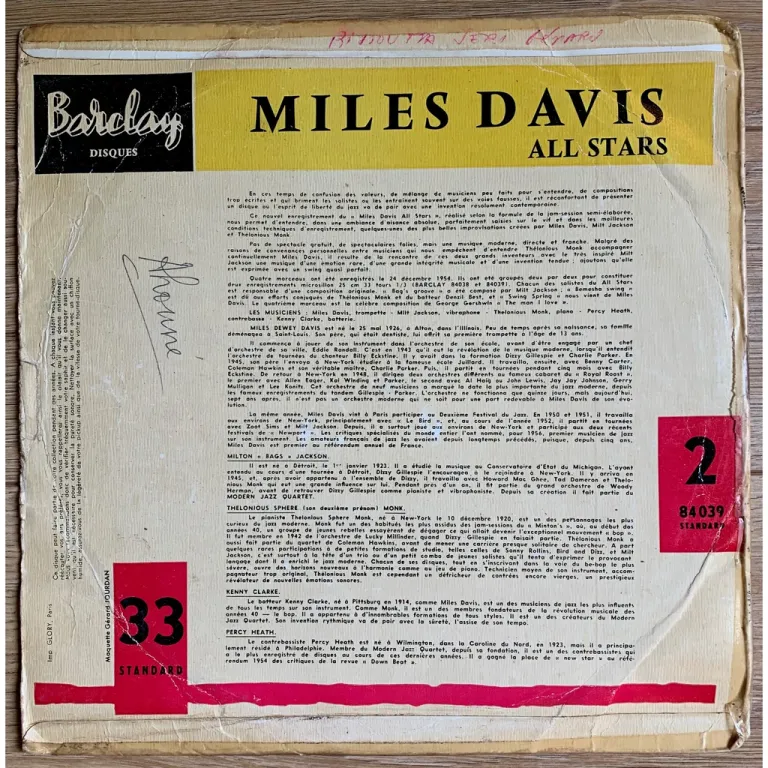 Cool jazz on top as recorded by the trumpet master backed by MiltjACKSON? Monk? Per& Kenny Clarke. Sleeve has aging & creases, writings on back & B label, transparent tape on edges, ringwear, tear & bump on mouth, record has very reasonable constant noise from numerous marks.