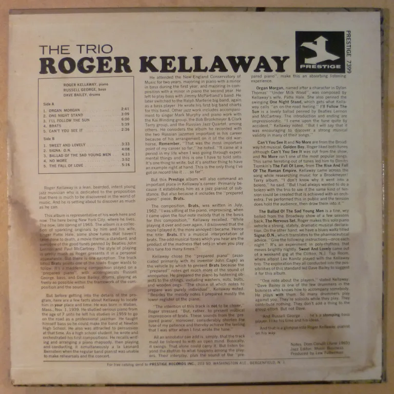 2 soul jazz winners on this piano trio LP w/ Russell George on bass & Dave Bailey on drums. 1972 repress of the '65 OG. Sleeve has large brownish water damage wear on bottom 3rd of back cover, small writings on labels. Record plays w/ very reasonable to hardly noticeable noise, varying from solid VG- to VG++ depending on parts.